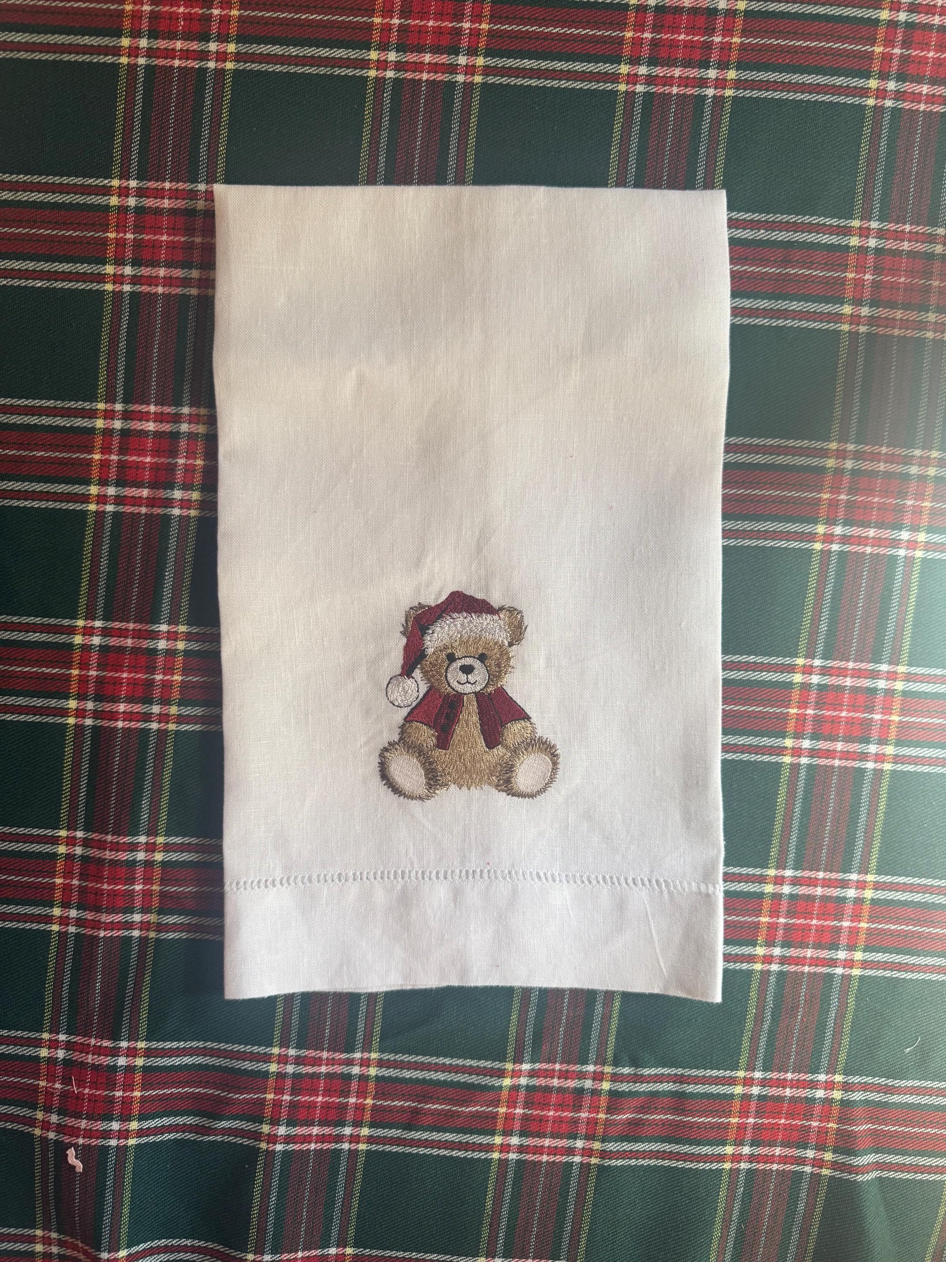 Bring a touch of cozy nostalgia to your home this holiday season with this embroidered Christmas bear towel. Each towel features a sweet teddy bear in a Santa hat and scarf, perfectly stitched on a crisp white linen hemstitch towel — the kind of piece that adds warmth and charm to your kitchen, powder room, or guest bath.